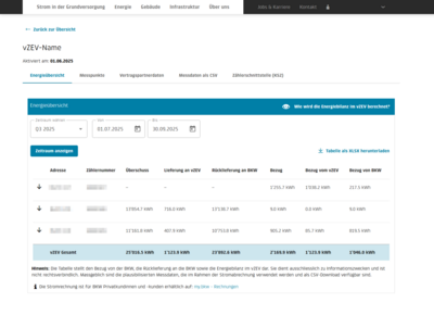 Die BKW ist verpflichtet, die Lastgangdaten (15-Minuten-Werte) der vZEV-internen Messpunkte der Ansprechperson unentgeltlich im Portal zur Verfügung zu stellen. Die Messdaten für die interne Abrechnung liefert die BKW der vZEV-Ansprechperson via vZEV-Portal im CSV- oder EBIX-Format. Das vZEV-Portal bietet zusätzlich eine praktische Energieübersicht im vZEV. Diese Energieübersicht soll die interne Abrechnung erleichtern.